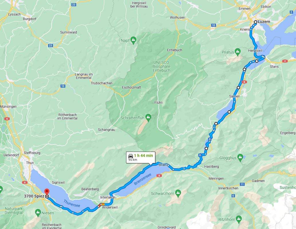 Wir besprechen die beiden Routen und entscheiden uns für die Fahrt durch die Schweiz, dem „Schwabenweg“ folgend bis Einsiedeln. Danach geht’s weiter über Sattel, Goldau und Küssnacht nach Luzern. Von dort vorbei am Sarnersee, Lungenersee und Brienzerseee nach Interlaken und weiter am Thunersee bis Spiez.