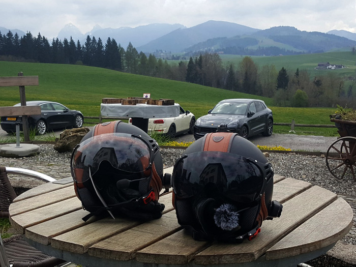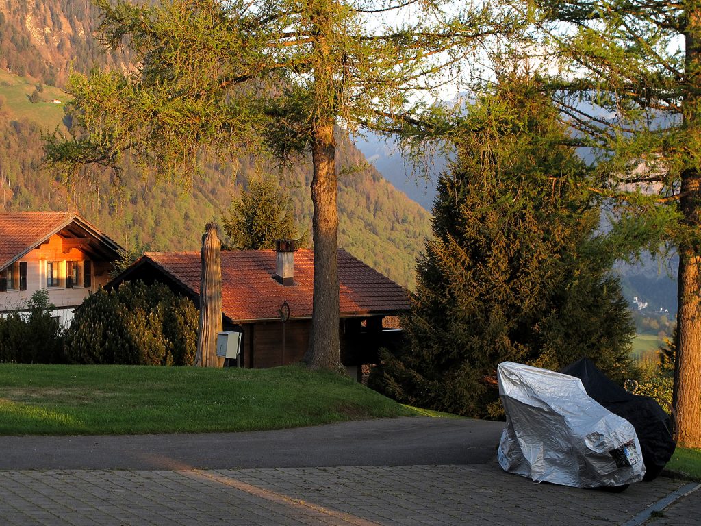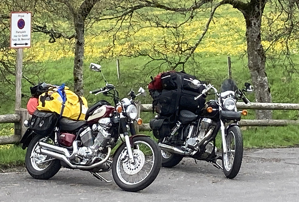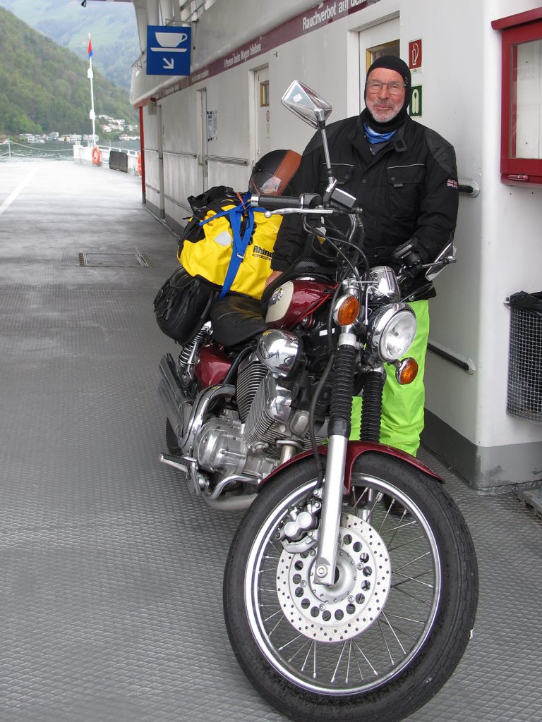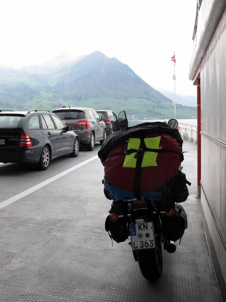 Die Pferde sind gesattelt und bepackt, will heißen: die Tanks sind befüllt, das Gepäck ist mit Spanngurten festgezurrt. Kurz vor 11:00 Uhr heulen die Motoren auf. Wir starten bei stark bewölktem Himmel in voller Regenmontur und rollen unter einer dichten Wolkendecke bei kühlen Temperaturen entspannt und mit moderater unserem Alter angemessenen Fahrgeschwindigkeit dahin. Auf dem Etzelpass kurz vor Einsiedeln brechen erstmals Sonnenstrahlen durch die Wolkendecke. Am Fährhafen nach Gersau und auf der Überfahrt nach Beckenried überrascht uns leichter Sprühregen. Danach fahren wir dem Regen hinterher; die Straßen sind nass, aber wir bleiben trocken bis wir am Abend Äschi erreichen.