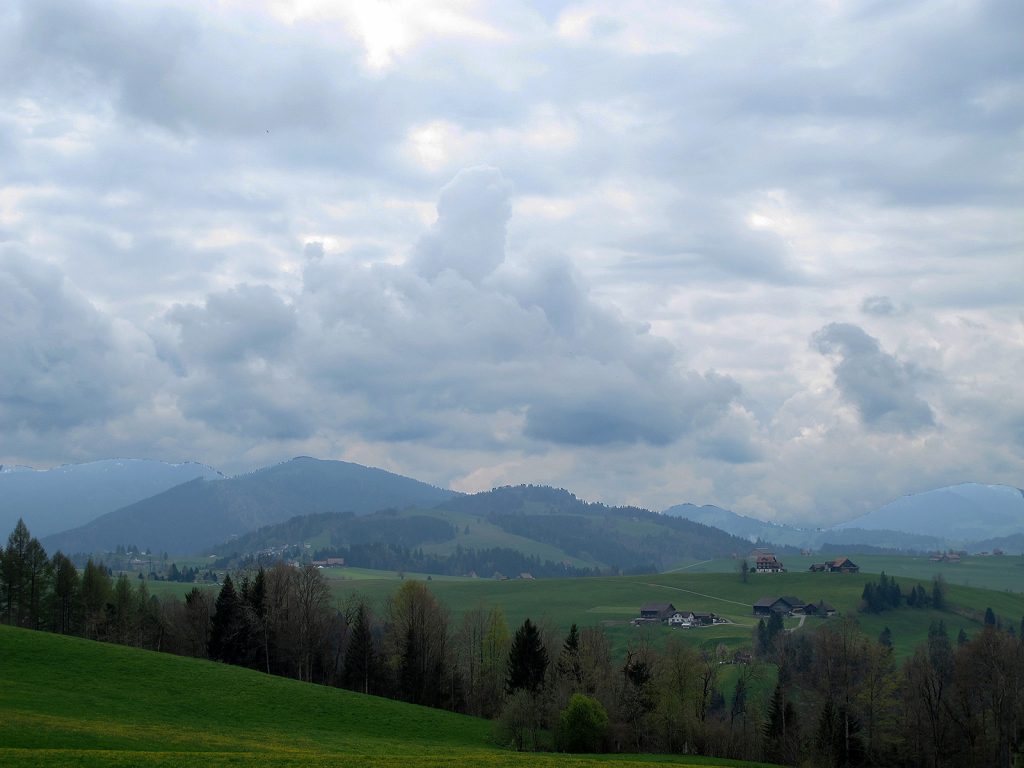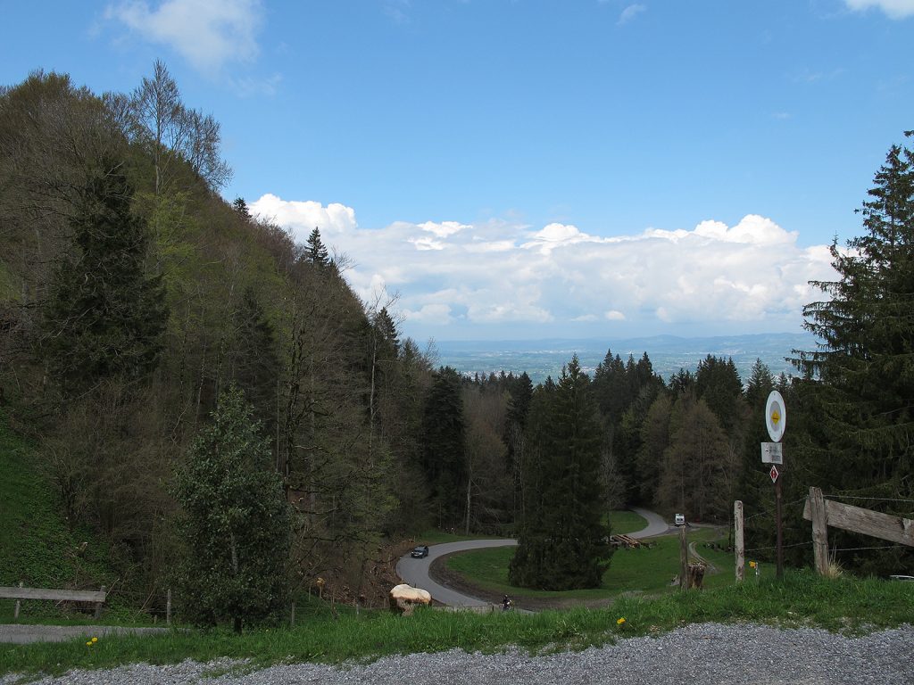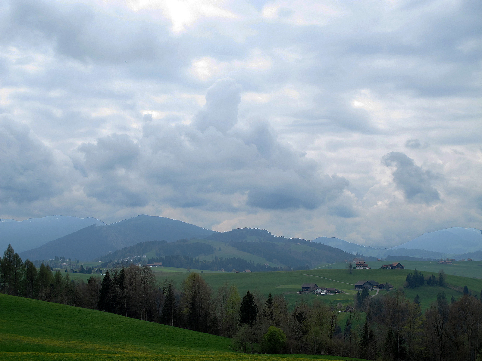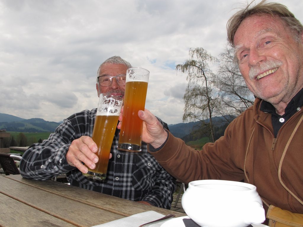 Die Pferde sind gesattelt und bepackt, will heißen: die Tanks sind befüllt, das Gepäck ist mit Spanngurten festgezurrt. Kurz vor 11:00 Uhr heulen die Motoren auf. Wir starten bei stark bewölktem Himmel in voller Regenmontur und rollen unter einer dichten Wolkendecke bei kühlen Temperaturen entspannt und mit moderater unserem Alter angemessenen Fahrgeschwindigkeit dahin. Auf dem Etzelpass kurz vor Einsiedeln brechen erstmals Sonnenstrahlen durch die Wolkendecke. Am Fährhafen nach Gersau und auf der Überfahrt nach Beckenried überrascht uns leichter Sprühregen. Danach fahren wir dem Regen hinterher; die Straßen sind nass, aber wir bleiben trocken bis wir am Abend Äschi erreichen.