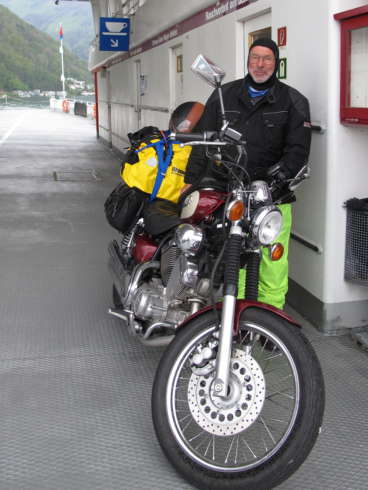 Dann geht die Fahrt weiter am Vierwaldstätter-See entlang bis nach Gersau, wo wir mit der Fähre übersetzen und ich gleich den ersten kleinen Unfall habe. An der steilen Zufahrt zur Fähre, die wir am anderen Ufer zu überwinden haben, muss ich nach dem Anfahren auf der Kuppe wegen eines Autos noch einmal schnell bremsen, gerate in Schieflage, kann die Maschine nicht mehr halten und schon liege ich unter dem Motorrad. Ich kann mich noch selbst befreien, bin glücklicherweise nicht verletzt und kann das Motorrad mit Victors Hilfe wieder aufstellen. Beim Anlassen meckert die Virago zwar noch ein bisschen, weil der Vergaser wohl zuviel Benzin geschluckt hat, aber bald schon können wir die Fahrt fortsetzen.
