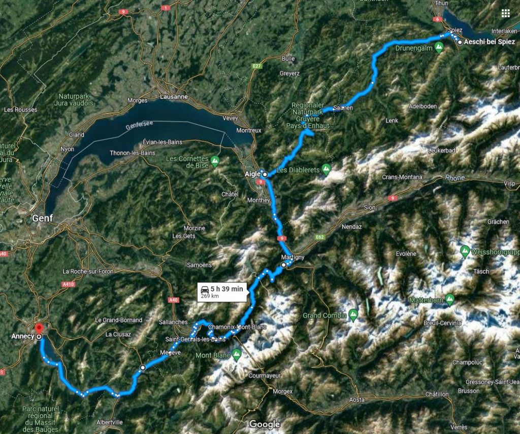Äschi –> Spiez –> Simmerntal –> Saanen –> Aigle –> Martigny –> Chamonix-Mont-Blanc –> Le Fayet –> Le Villard –> Saint-Nicolas-la Chapelle –> Ugine –> Doussard –> Annecy